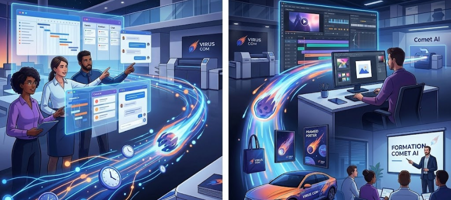 En combinant l’expertise historique de Virus Com en impression et signalétique avec la puissance stratégique de Comet AI, nous offrons une solution à 360°. Du concept généré par IA jusqu’à sa pose physique, nous gérons l’intégralité de la chaîne de valeur tout en rendant vos équipes autonomes.